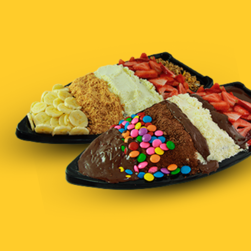 🍧 Escolha a base, frutas, cremes para criar a combinação perfeita! 💜🍓🍌🥥✨